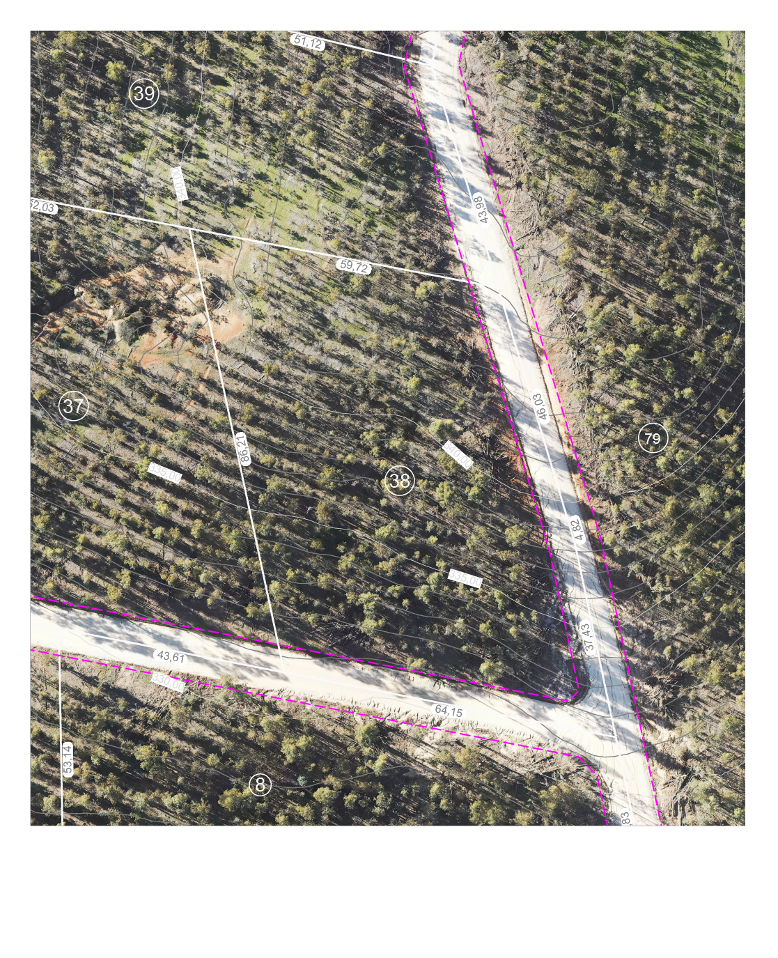 Norte: en 59,72 metros con el Lote 39 del mismo plano de subdivisión. Este: en 46,03 metros, en 4,82 metros y en 37,43 metros, servidumbre de tránsito de por medio, con el Lote 79 del mismo plano de