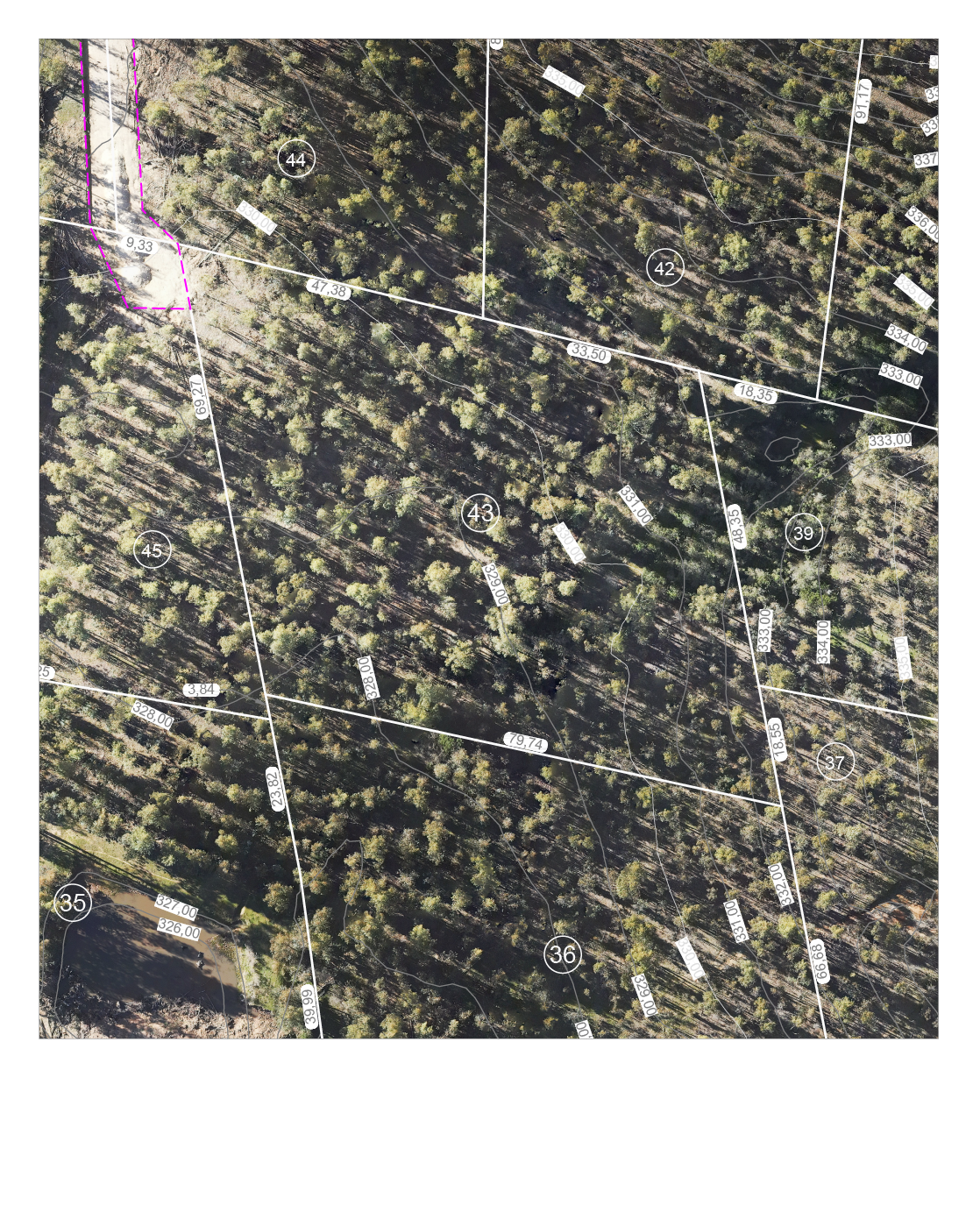 plano de subdivisión. Este: en 48,35 metros con el Lote 39 y en 18,55 metros con Lote 37, ambos del mismo plano de subdivisión. Suroeste: en 79,74 metros con el Lote 36 del mismo plano de subdivisión. Oeste: en 69,27 metros, servidumbre de tránsito de por medio, con el Lote 45 del mismo plano de subdivisión.