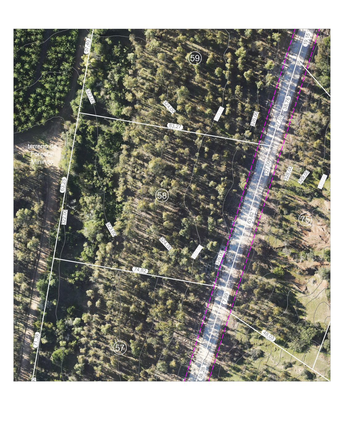 Norte: en 83,27 metros con el Lote 59, del mismo plano de subdivisión. Sureste: en 63,82 metros, servidumbre de tránsito de por medio, con el Lote 75, del mismo plano de subdivisión. Suroeste: en 74,82 metros, con el Lote 57, del mismo plano de subdivisión. Oeste: en 63,25 metros con terreno de forestal Mininco, separado por cerco.