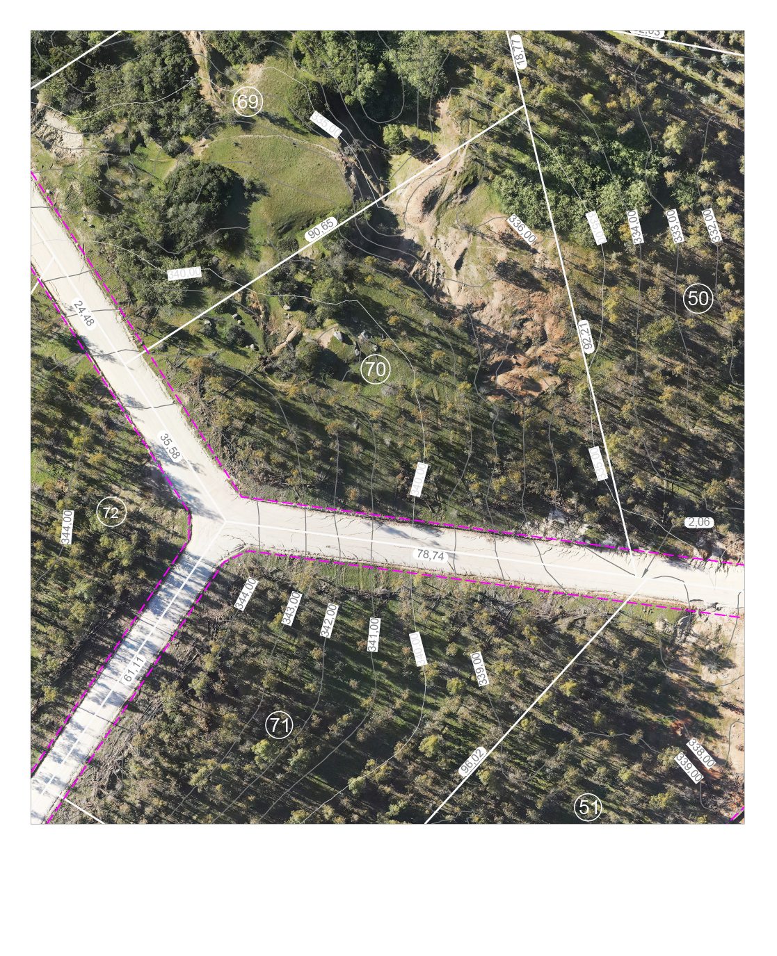 Noreste: 92,21 metros, con Lote 50, del mismo plano de subdivisión. Sur: en 78,74 metros, servidumbre de tránsito de por medio, con Lote 71, del mismo plano de subdivisión. Suroeste: en 35,58 metros, servidumbre de tránsito de por medio, con Lote 72, del mismo plano de subdivisión. Noroeste: en 90,65 metros, con Lote 69, del mismo plano de subdivisión.